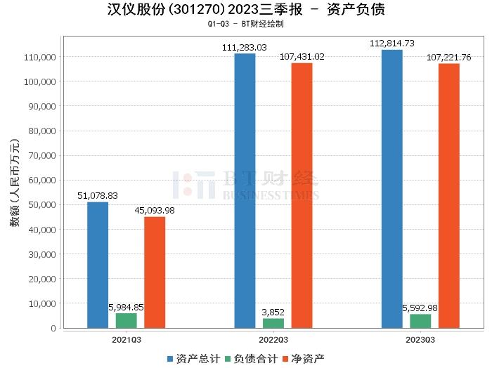 在资产负债方面,2023年三季度,汉仪股份的总资产为11.28亿元,相较于上年度末的11.42亿元有所减少。负债合计5592.98万元,略高于上年度末的5559.24万元。公司的净资产为10.72亿元,较上年度末的10.86亿元有所下降。资产负债率为4.96%,略高于上年度末的4.87%。