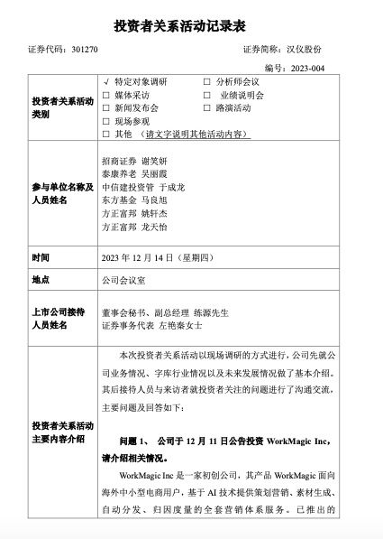 汉仪股份于12月11日公告投资WorkMagic Inc,公司向机构投资者介绍了相关情况。WorkMagic Inc是一家初创公司,其产品WorkMagic面向海外中小型电商用户,基于AI技术提供策划营销、素材生成、自动分发、归因度量的全套营销体系服务。已推出的WorkMagic Copilot营销助手,功能涵盖创意内容生成和营销自动化两大模块。
