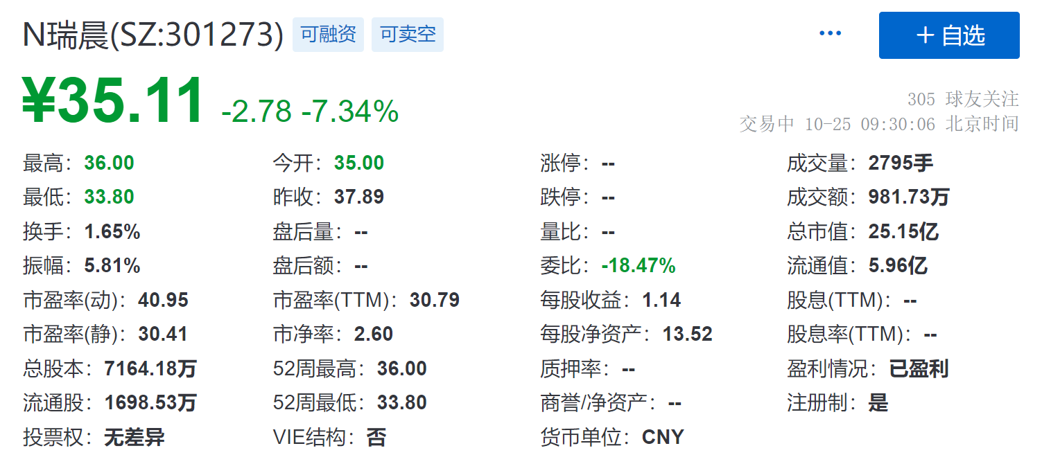 10月25日,截至9:30,N瑞晨(SZ:301273)下跌7.34%,现报35.11元,成交额为981.73万元,总市值为25.15亿元。