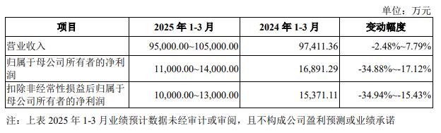 2025年1-3月,汉朔科技预计营业收入为9.50亿元至10.50亿元,同比变动-2.48%至7.79%;公司预计归属于母公司所有者的净利润为1.10亿元至1.40亿元,同比下降17.12%至34.88%;扣除非经常性损益后的归属于母公司股东的净利润预计为1.00亿元至1.30亿元,同比下降15.43%至34.94%。