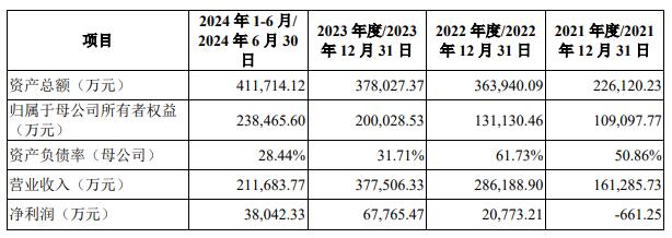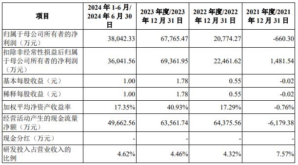 2021年、2022年、2023年、2024年1-6月,汉朔科技实现营业收入分别为161,285.73万元、286,188.90万元、377,506.33万元、211,683.77万元;归属于母公司所有者的净利润分别为-660.30万元、20,774.27万元、67,765.47万元、38,042.33万元;扣除非经常性损益后归属于母公司所有者的净利润分别为1,481.54万元、22,461.62万元、69,361.95万元、36,041.56万元。