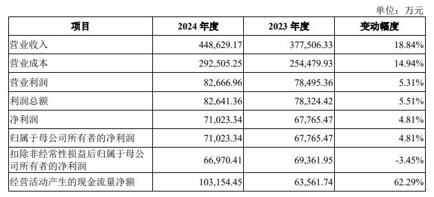 2024年,汉朔科技实现营业收入448,629.17万元,同比增长18.84%;司归属于母公司所有者的净利润为71,023.34万元,同比增长4.81%;扣除非经常性损益后归属于母公司所有者的净利润66,970.41万元,同比减少3.45%;经营活动产生的现金流量净额103,154.45万元,同比增长62.29%。