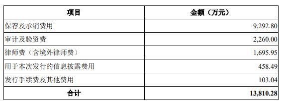 汉朔科技本次发行费用(不含增值税)总额为13,810.28万元,其中保荐及承销费用9,292.80万元。