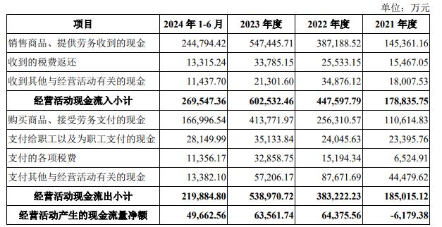 上述同期,公司销售商品、提供劳务收到的现金分别为145,361.16万元、387,188.52万元、547,445.71万元、244,794.42万元;经营活动产生的现金流量净额分别为-6,179.38万元、64,375.56万元、63,561.74万元、49,662.56万元。