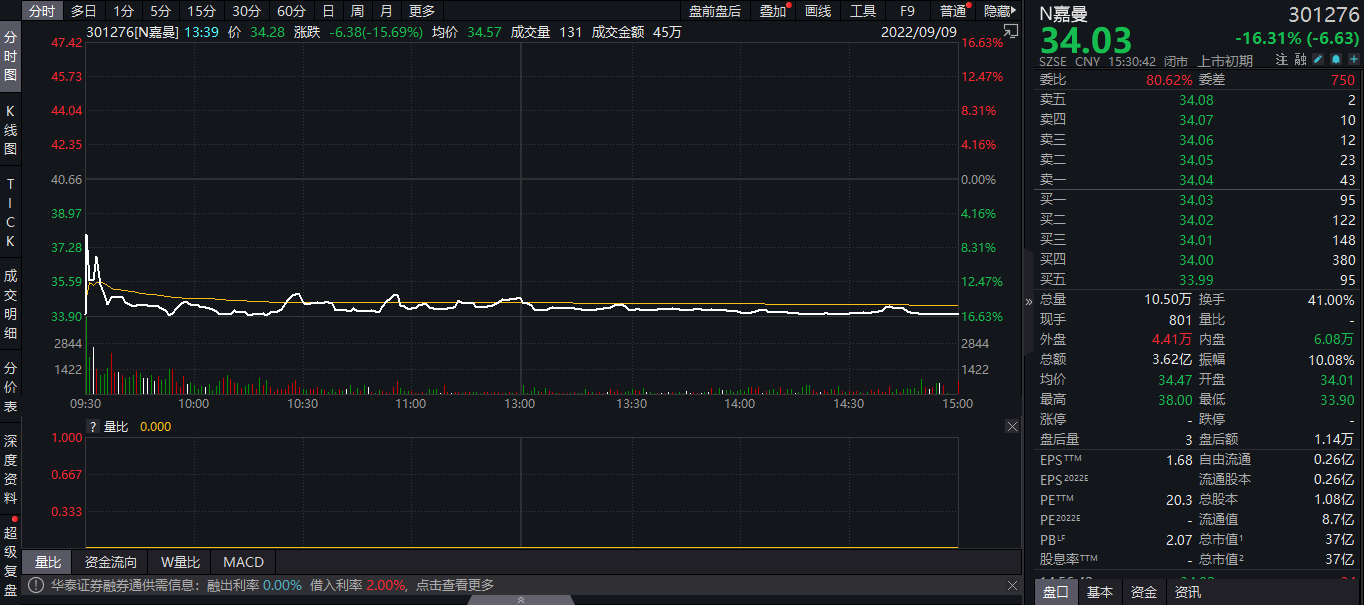 9月9日,嘉曼服饰(301276.SZ)在深交所创业板上市,发行价格40.66元/股。然而嘉曼服饰开盘报34.01元/股,开盘即破发。截至收盘,嘉曼服饰报34.03元/股,跌幅16.31%,总市值36.75亿元。