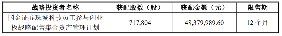 本次发行股份16,283,400股,发行价格67.40元/股。根据最终确定的发行价格,发行人的高级管理人员与核心员工专项资产管理计划最终战略配售股份数量为717,804股,约占本次发行数量的4.41%。