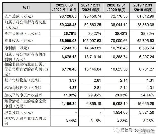 招股书显示,珠城科技2019年、2020年、2021年营收分别为6.27亿元、7.09亿元、10.5亿元;净利分别为6505.74万元、1.08亿元、1.46亿元;扣非后净利分别为6761万元、1亿元、1.31亿元。