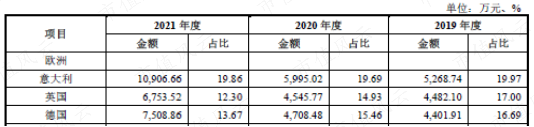 这里只提及欧洲,是因为欧洲一直是公司最主要的出口地区,欧洲市场对公司的出口收入有决定性影响。2019-2021年,出口到欧洲的收入一直占整个出口收入的60%左右。
