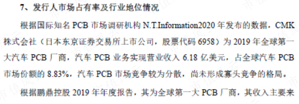 以公司所在的汽车电子PCB市场为例,CMK株式会社是全球最大的汽车PCB厂商,占全球汽车PCB的市场份额也才8.83%(2019年)。
