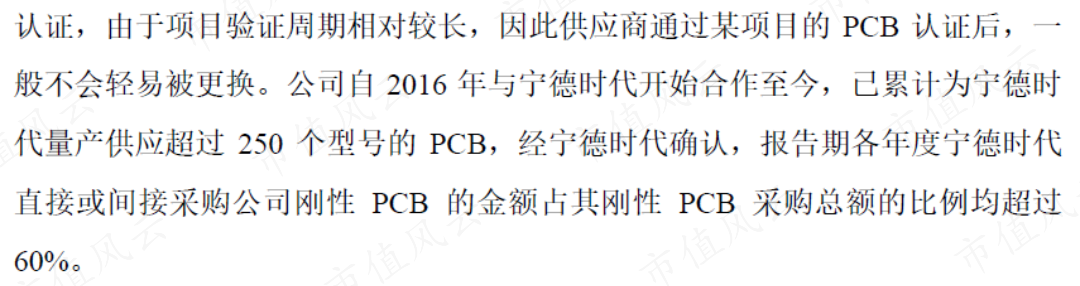 技术攻关成功之后,公司开始大批量向宁德时代供应BMS用PCB,并最终成为宁德时代最大的PCB供应商。经宁德时代确认,2019-2021年,宁德时代向公司采购的刚性PCB金额占其刚性PCB采购总额的比例一直超过60%。