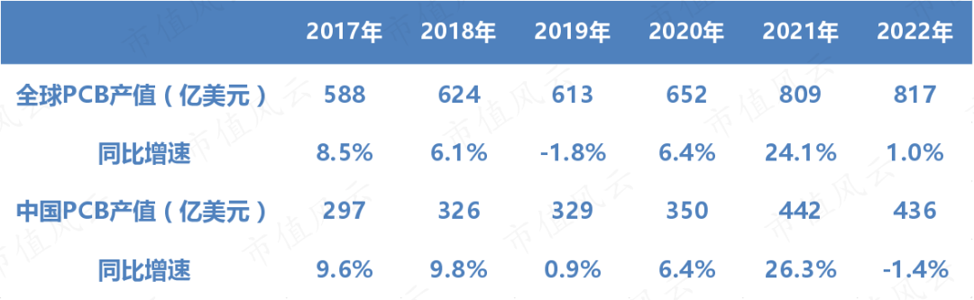 根据Prismark的数据,2017-2022年期间,全球PCB产值出现下滑的年份只有2019年,当年产值同比下降1.8%。除了2019年,其余年份都是同比增长的。而增速最低的就是2022年,当年产值同比增长仅1%。