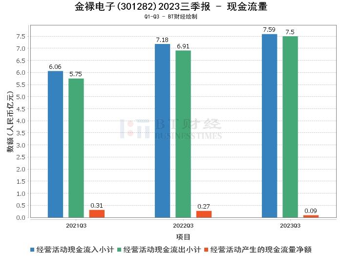 在现金流量方面,2023年三季度,金禄电子的经营活动产生的现金流量净额为855.29万元,相比上年同期的2747.26万元大幅下降。经营活动现金流入小计为7.59亿元,相比上年同期的7.18亿元有所增长。经营活动现金流出小计为7.5亿元,相比上年同期的6.91亿元有所增长。