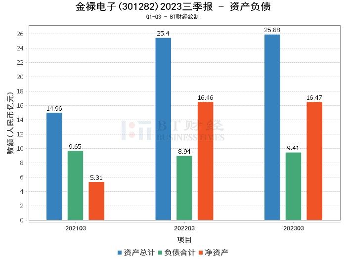 在资产负债方面,2023年三季度末,金禄电子的总资产为25.88亿元,相比上年度末的24.47亿元有所增长。负债合计为9.41亿元,相比上年度末的7.58亿元增加。净资产为16.47亿元,相比上年度末的16.89亿元有所减少。资产负债率为36.35%,相比上年度末的30.99%有所上升。