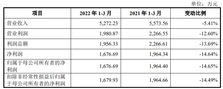 2022年1-3月,公司实现营业收入5,272.23万元,较上年同期下降5.41%;实现净利润1,676.69万元,较上年同期下降14.64%;实现扣除非经常性损益后归属于母公司所有者的净利润1,679.93万元,较上年同期下降14.49%。