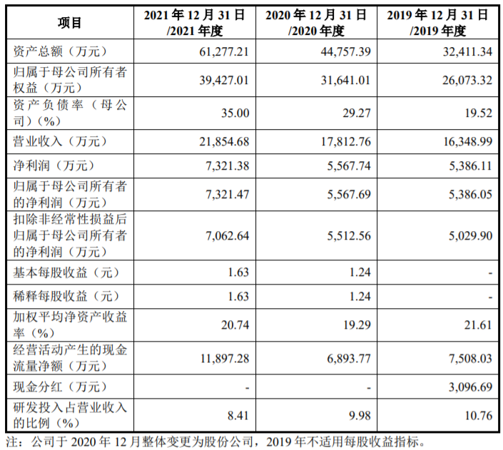 2019年至2021年,国缆检测的营业收入分别为16,348.99万元、17,812.76万元、21,854.68万元;净利润分别为5,386.11万元、5,567.74万元、7,321.38万元;扣除非经常性损益后归属于母公司所有者的净利润分别为5,029.90万元、5,512.56万元、7,062.64万元;经营活动产生的现金流量净额分别为7,508.03万元、6,893.77万元、11,897.28万元。