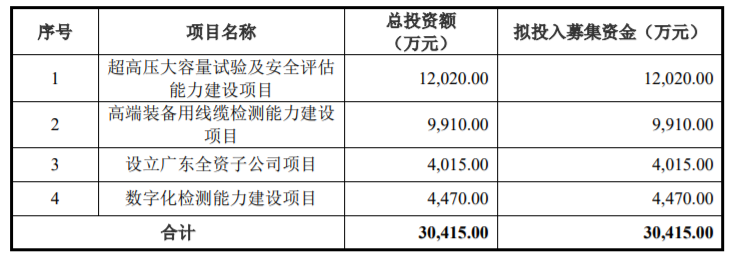 国缆检测本次募集资金总额为50,325.00万元,扣除发行费用后实际募集资金净额为42,892.48万元,最终募集资金净额比原计划多12,477.48万元。国缆检测6月9日披露的招股说明书显示,公司拟募集资金30,415.00万元,分别用于超高压大容量试验及安全评估能力建设项目、高端装备用线缆检测能力建设项目、设立广东全资子公司项目、数字化检测能力建设项目。