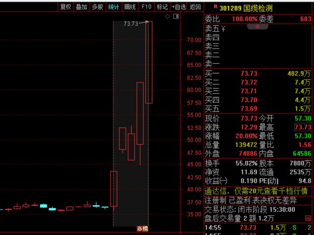 8月7日,国缆检测低开高走,尾盘再度封住涨停,截止收盘,国缆检测报于73.73元,总市值为57.5亿。