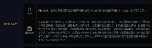 7月31日,在被问及是否具备检测超导材料的能力时,国缆检测表示,公司检验检测业务主要划分为中高压线缆、低压电缆、通信电缆及光纤光缆、电工材料及电器附件、能力验证五大领域。目前超导电缆主要归为中高压线缆领域,公司持续发展试验检测技术与条件建设,包括高温超导电缆及系统测试实验室的条件完善与能力提升工作。公司的控股股东上海电缆研究所有限公司是上海国际超导科技有限公司的第二大股东。
