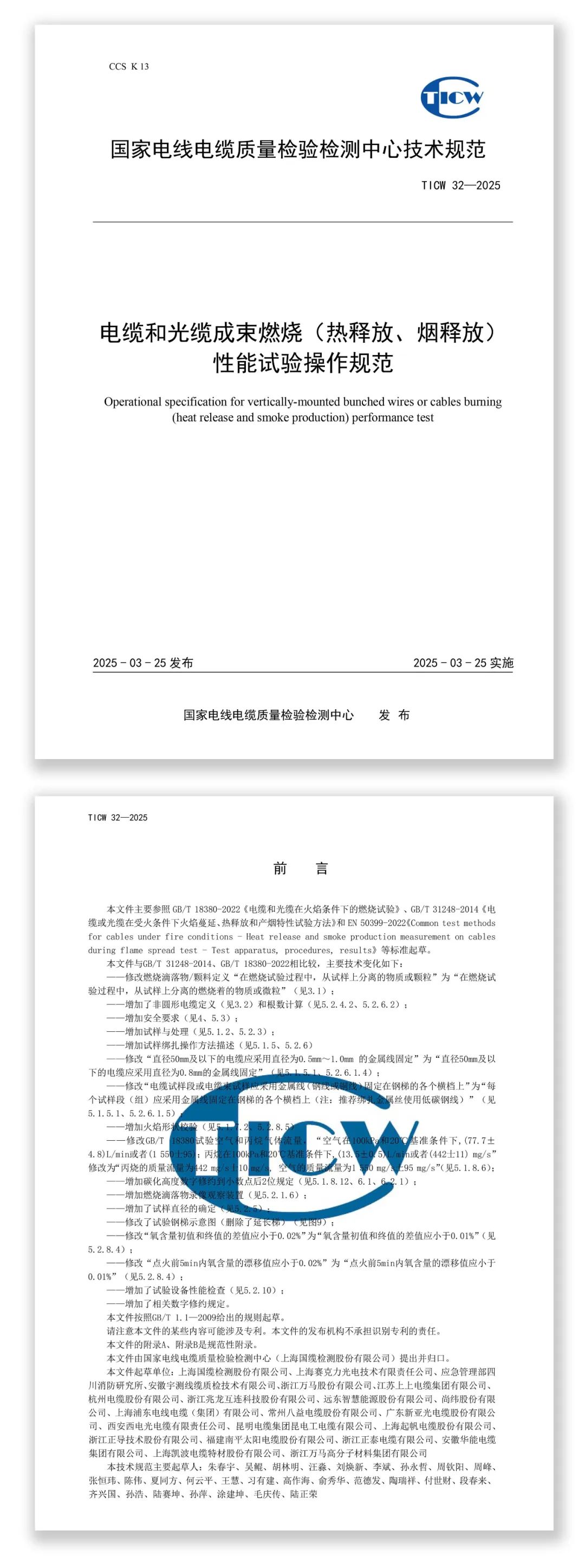 试验操作规范规定了电缆或光缆在受火条件下火焰蔓延、热释放和产烟特性试验的作业程序、实验结果评价及试验报告,试验装置及检定校准规范涵盖了GB/T 18380和GB/T 31248成束燃烧试验装置的技术要求、试验装置的标定、检定校准项目及方法,为提升燃烧试验测试结果的一致性和稳定性提供了有力的技术支撑。规范的制定和发布对推动行业阻燃技术的进步和行业的发展将起到积极作用,同时也为后续标准换版升级工作奠定了的基础。