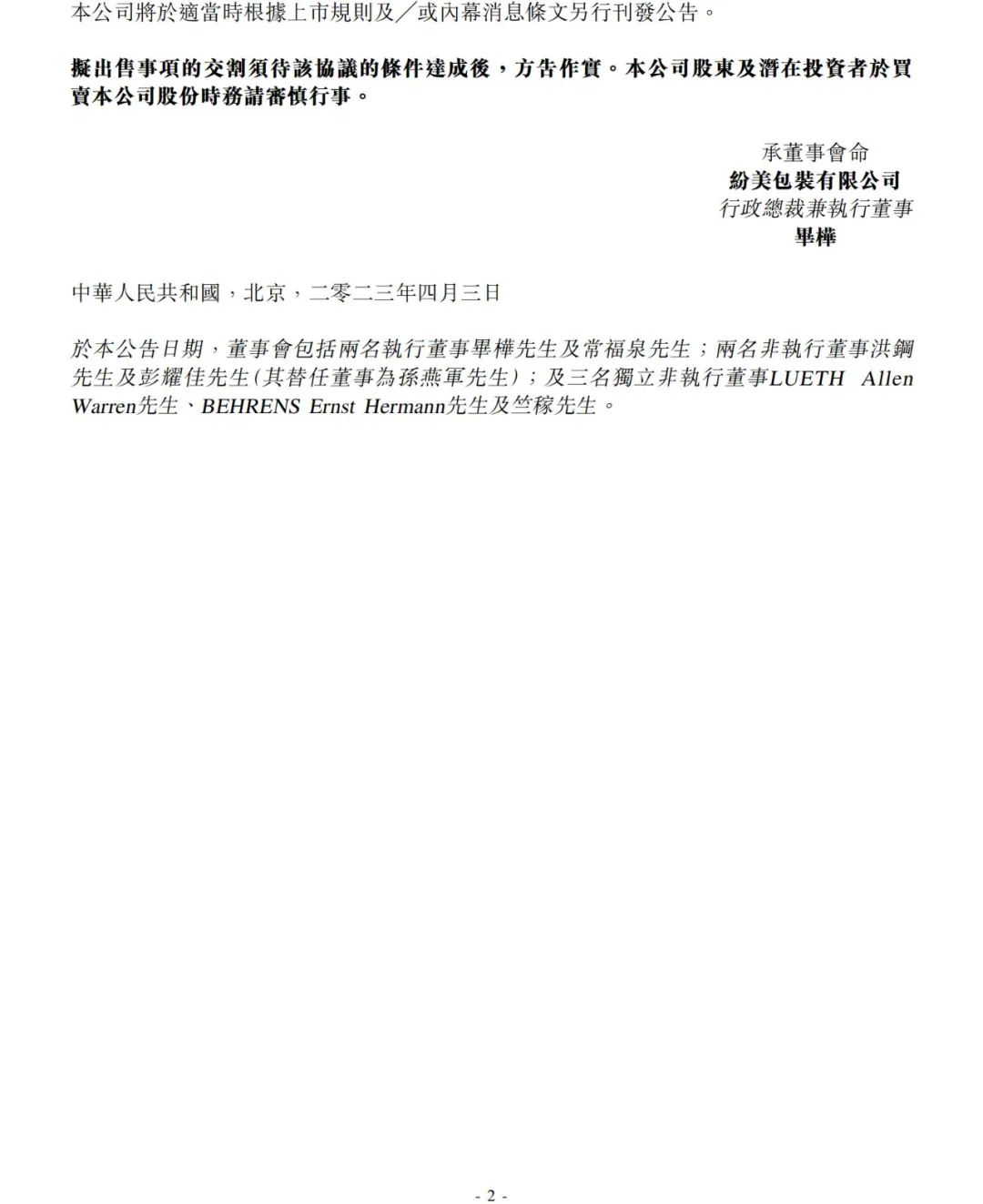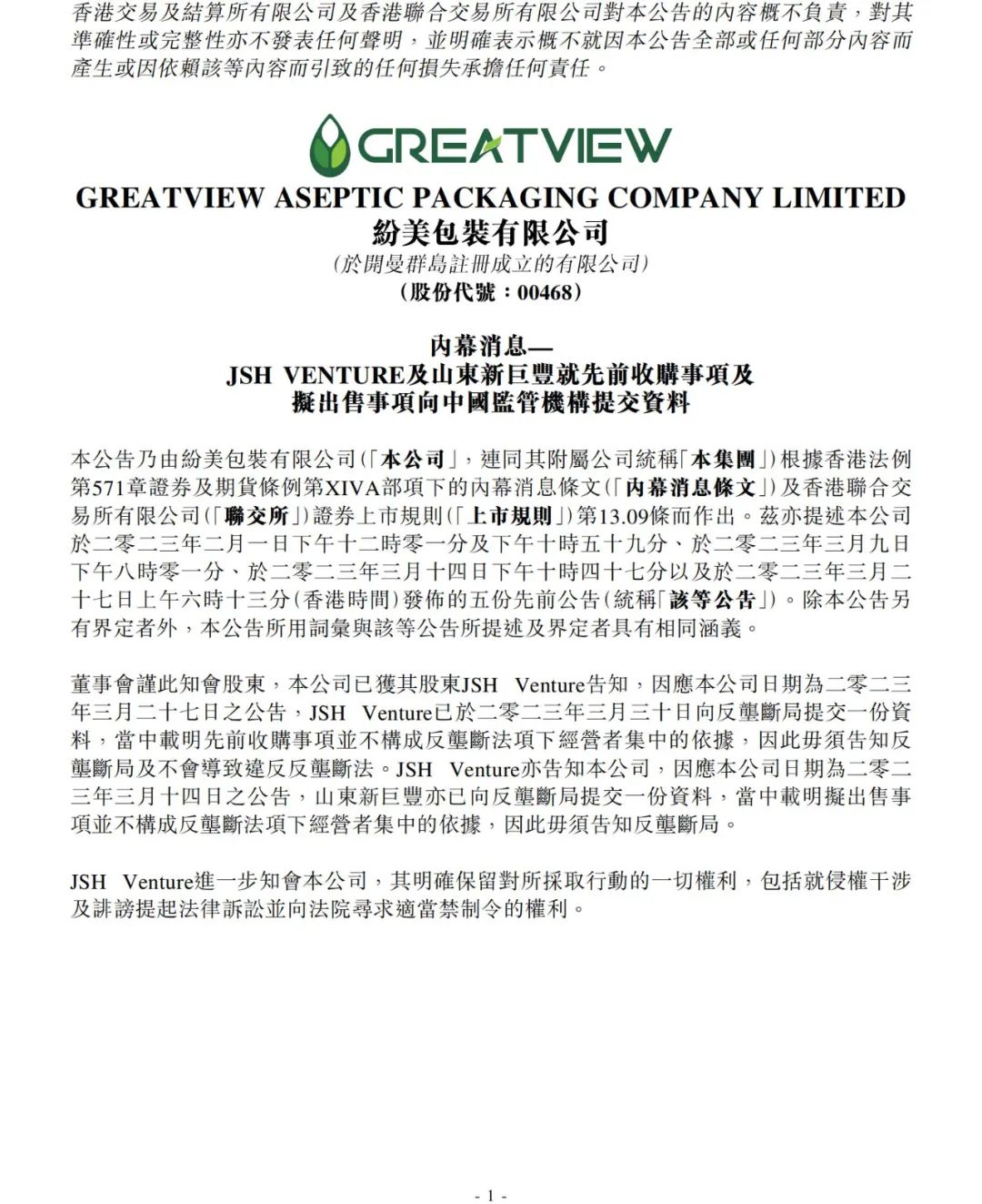 2023年4月3日,国内食品无菌包装公司纷美包装有限公司(“纷美包装”)发布公告,其股东JSH Venture Holdings Limited (“JSH Venture”)已于2023年3月30日向反垄断局提交资料,其中载明先前收购事项不构成反垄断法项下经营者集中的依据。山东新巨丰科技包装股份有限公司(“新巨丰包装”)亦已向反垄断局提交资料,其中载明拟出售事项不构成反垄断法项下经营者集中的依据。JSH Venture表示,明确保留对所采取行动的一切权利,包括就侵权干涉及诽谤提起法律诉讼并向法院寻求适当禁制令的权利。此前,纷美包装曾于2023年3月14日发布公告,称新巨丰包装就其拟以协议转让方式收购JSH Venture持有的纷美包装28.22%股份的交易(即“拟出售事项”)向市场监管总局反垄断局进行申报,而拟出售事项中的纷美包装股份实为在先前交易(即“先前收购事项”)中收购的纷美包装股份。2023年3月27日,纷美包装发布公告称,公司董事认为JSH Venture先前收购事项构成经营者集中,已向国家市场监督管理总局反垄断局提出反垄断举报。