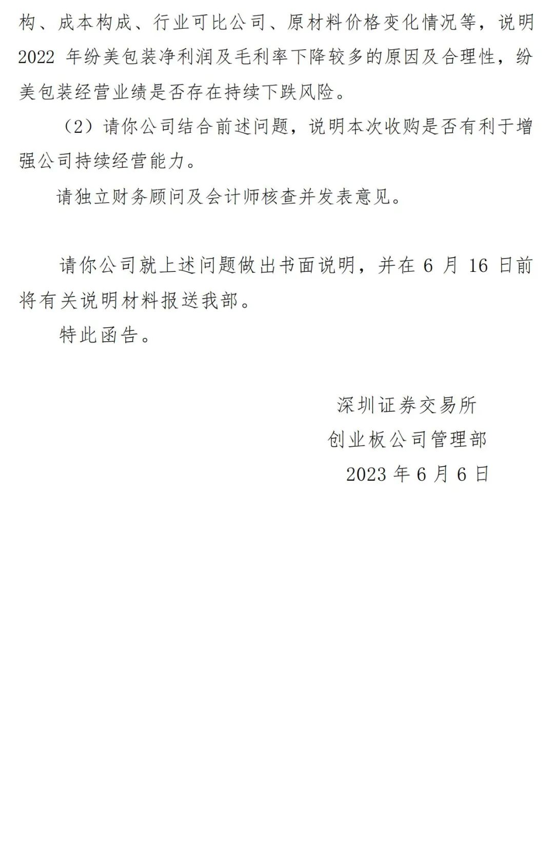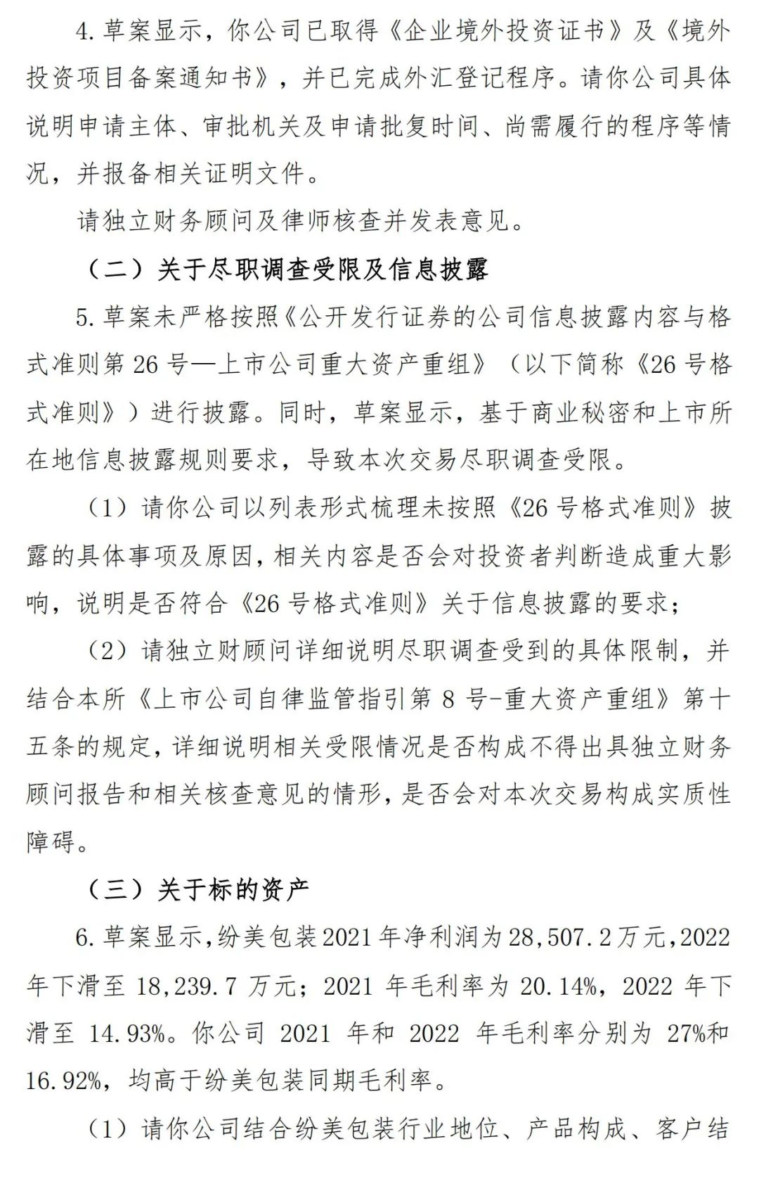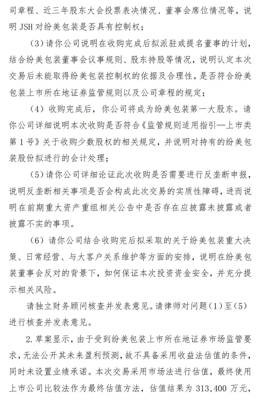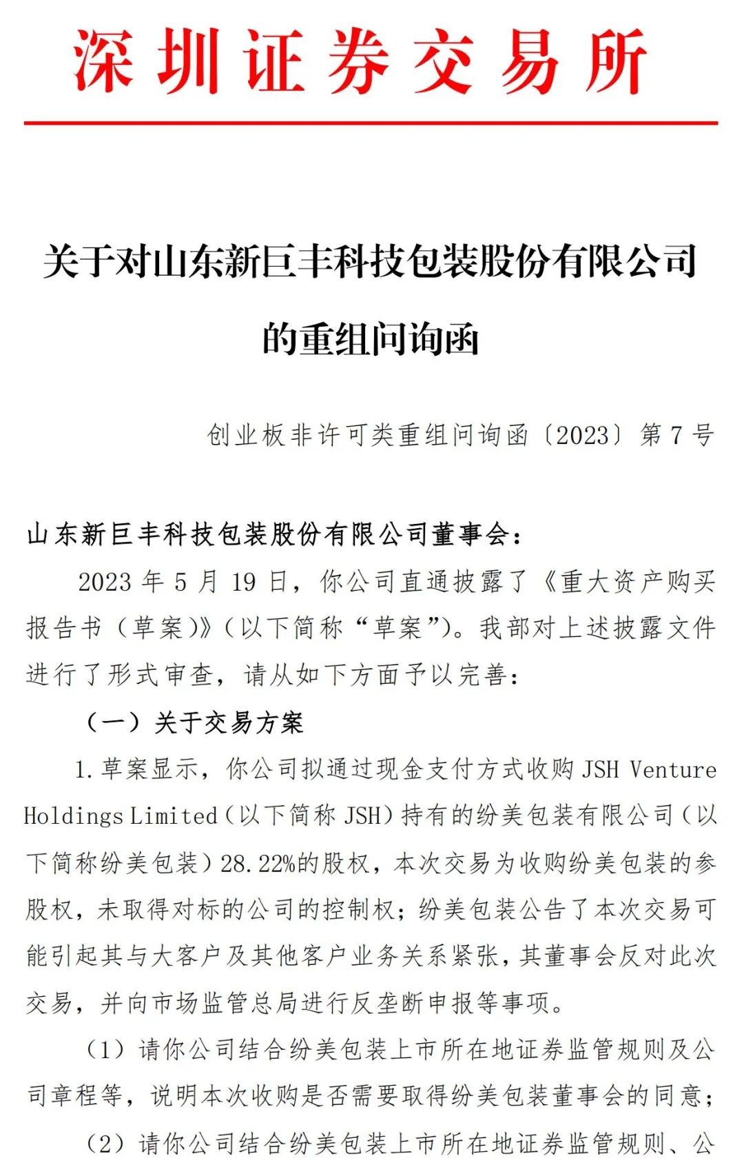 2023年6月6日,根据深圳证券交易所(“深交所”)网站披露,深交所就国内食品无菌包装公司山东新巨丰科技包装股份有限公司(“新巨丰包装”)重组收购同业竞争企业纷美包装有限公司(“纷美包装”)股权事宜下发问询函。2023年5月19日,新巨丰包装宣布计划收购纷美包装28.22%的股权,该交易遭到纷美包装股东及董事会反对,纷美包装部分股东已递交反垄断申报。纷美包装已于3月14日向国家市场监督管理总局(“市场监管总局”)递交申报,而新巨丰包装却在报告草案中表示无需进行申报。对此,深交所在问询函中要求新巨丰包装说明以下与反垄断相关问题:(1)本次收购是否需要取得纷美包装董事会的同意;(2)纷美包装股东JSH对该公司是否具有控制权;(3)本次收购未取得纷美包装控制权的依据及合理性、交易合规性以及交易后董事派驻或提名计划;(4)本次收购是否符合关于收购少数股权的相关规定以及拟进行的会计处理;(5)是否需要进行申报,以及反垄断事项是否构成交易实质性障碍等。(竞争法视界)