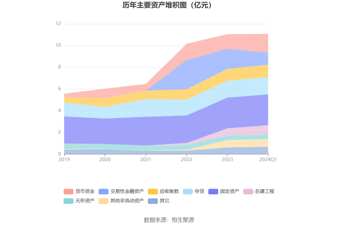 资产重大变化方面,截至2024年一季度末,公司交易性金融资产较上年末减少40.85%,占公司总资产比重下降6.88个百分点;货币资金较上年末增加29.30%,占公司总资产比重上升3.56个百分点;在建工程较上年末增加27.49%,占公司总资产比重上升1.65个百分点;应收账款较上年末增加4.44%,占公司总资产比重上升0.44个百分点。