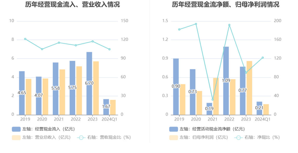 2024年第一季度,公司营业收入现金比为104.85%,净现比为121.98%。