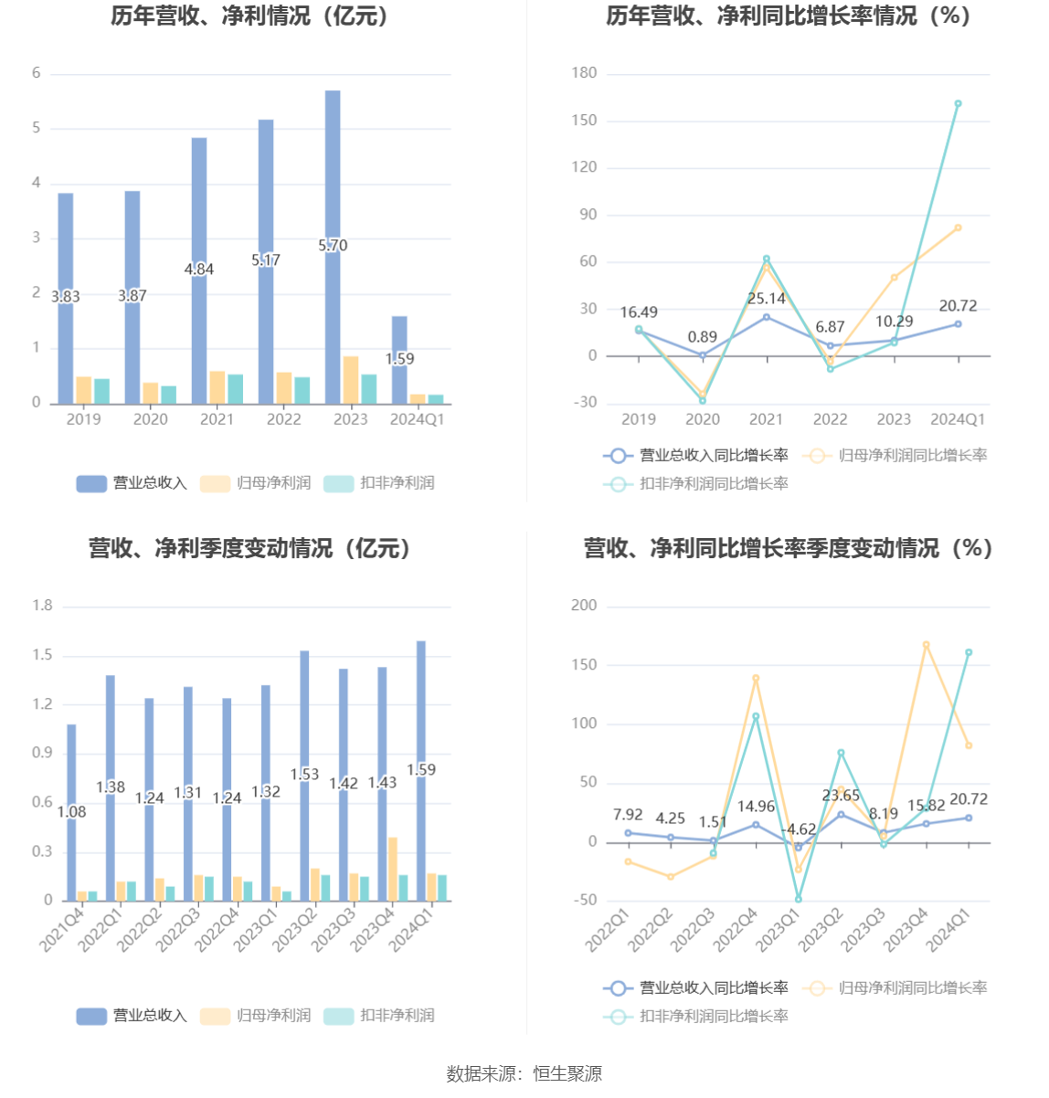 2024年第一季度,公司毛利率为29.04%,同比上升3.98个百分点;净利率为10.86%,较上年同期上升3.66个百分点。