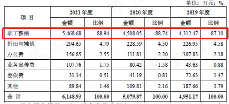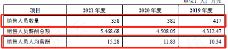 销售费用中接近90%都是支付给员工的薪酬。销售人员数量减少,人均薪酬大幅增长,相较2019年,2021年人均薪酬增长近50%。