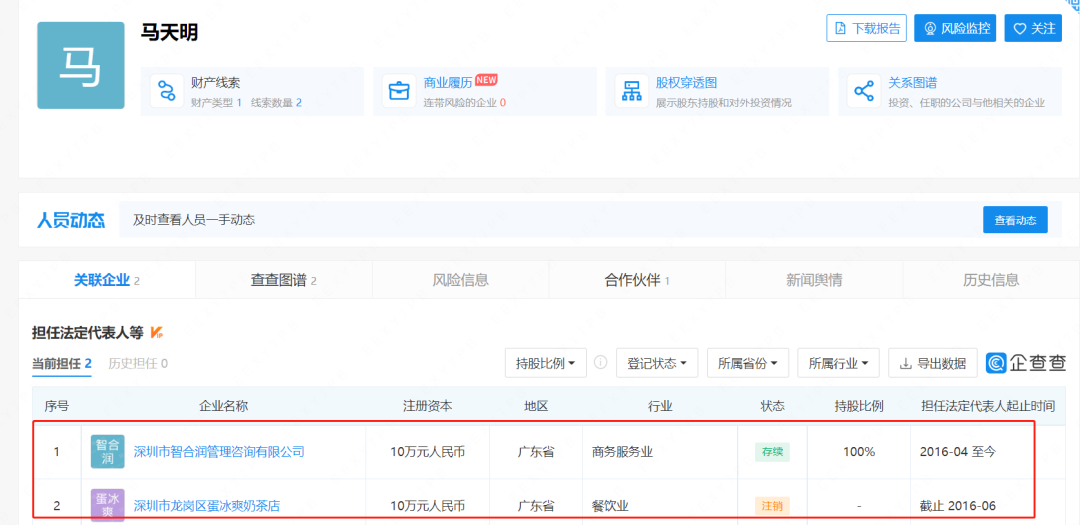 排除数据有误,前后两家公司业务跨度之广实在令人匪夷所思,唯一的解释就是这家奶茶店是马天明先生的副业。