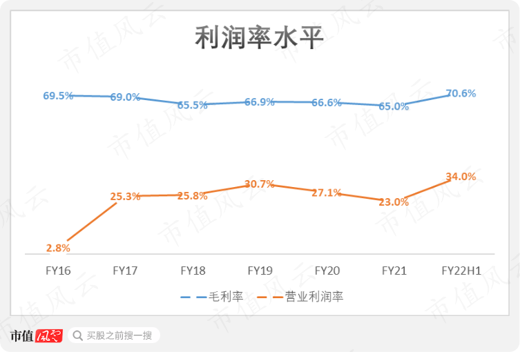 营业利润率也在2022年上半年扭转下降趋势升至34.0%。