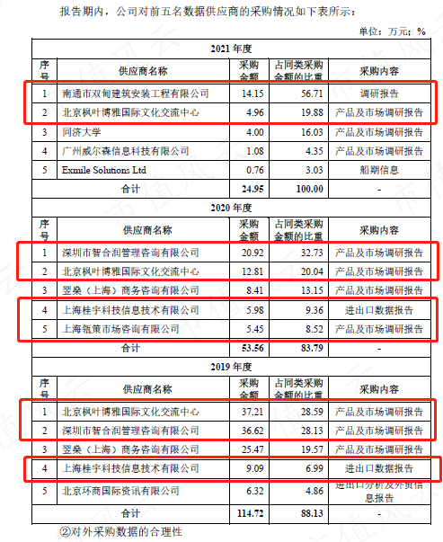 公司从前五名数据供应商处的采购金额总和从2018年的227.48万元急速下降至2021年的24.95万元,并且2020年排名第一的深圳市智合润管理咨询有限公司(下称“深圳智合润”)在2021年就不再与公司有任何业务往来。