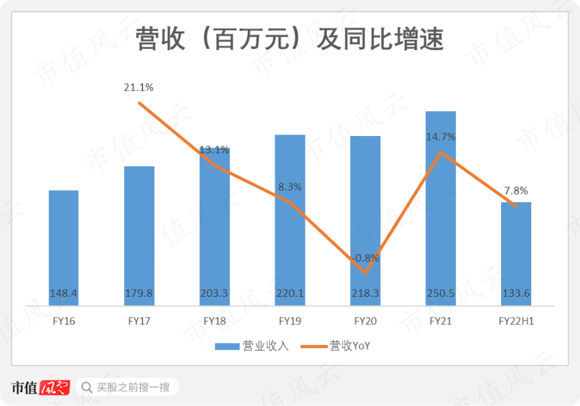 2021年,公司实现营业收入2.5亿元,以2016年为基准,CAGR为11%。营收增速在2017-2020年间逐年下滑,在2021年回升至14.7%。