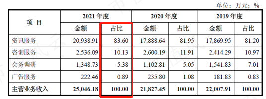 其中,资讯服务是公司的核心产品,营收贡献在80%以上,并且最近三年呈现小幅增长趋势,至83.6%。咨询服务和会务调研的占比分别为10.1%和5.4%。