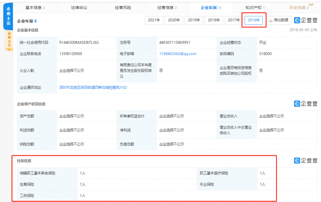 不过根据社保信息,2016年深圳智合润的参保人员只有1人。