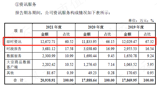 资讯业务中,即时资讯占比最高,为60.5%。时段报告、数据服务、大宗商品数据客户端的占比均呈现逐年递增态势,2021年占比分别为17.6%、11.0%和10.5%。