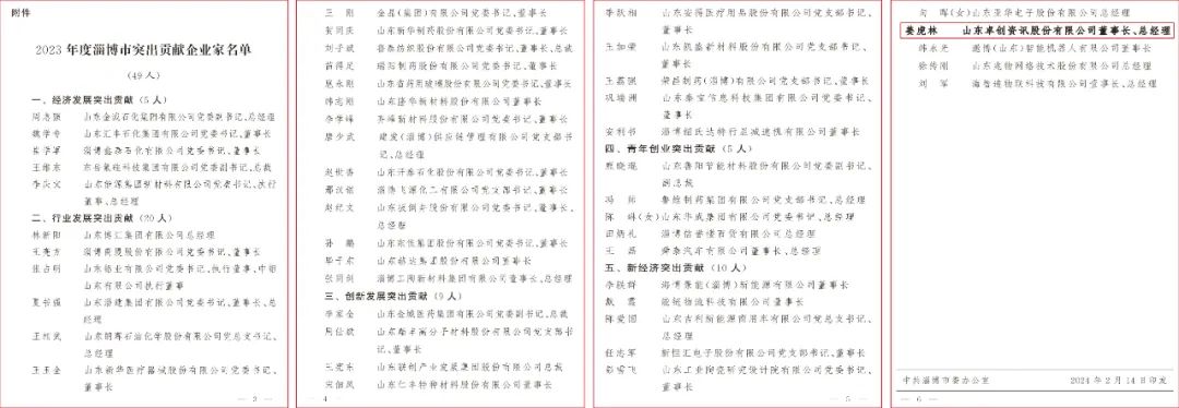 2月19日,中共淄博市委、淄博市人民政府发布“关于表扬2023年度淄博市突出贡献企业家的通报”。卓创资讯董事长姜虎林荣膺“2023年度淄博市突出贡献企业家”称号。