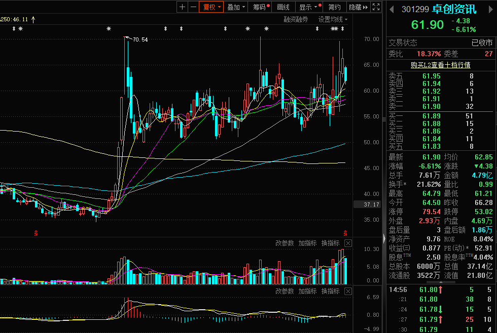 截至1月15日收盘,卓创资讯股价为61.90元/股,当日跌幅为6.61%。据此计算,鲁华和吕春江上述减持109.35万股股份,合计套现约6768.77万元。