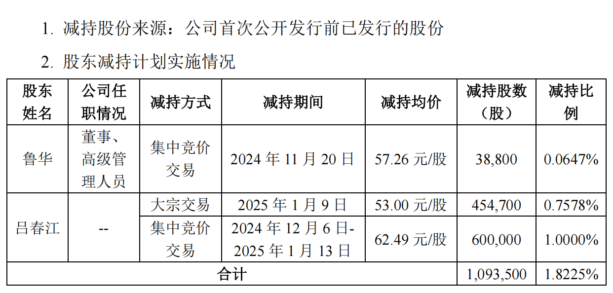 1月14日,卓创资讯发布公告称,该公司收到董事、高级管理人员鲁华和持股5%以上股东吕春江分别出具的《关于股份减持计划实施完毕的告知函》,2人合计减持该公司股份109.35万股,并于2025年1月13日实施完成。本次减持股份来源为该公司首次公开发行前已发行的股份,即原始股。