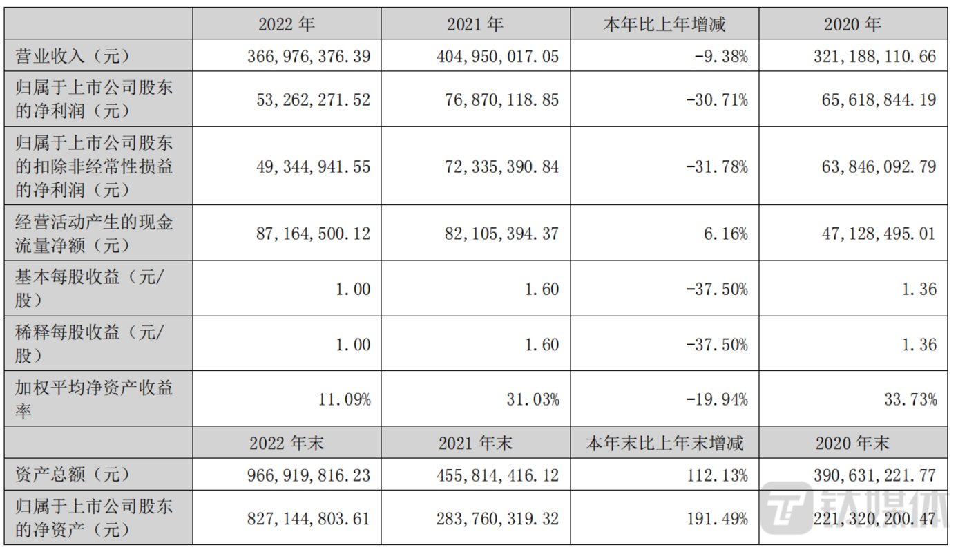 公司于2022年8月在深交所创业板上市,但是上市以后,业绩随即出现变脸。2022年度,公司实现归母净利润5326.23万元,同比减少30.71%;营业收入3.67亿元,同比下滑9.38%。值得一提的是,公司在2022年营利均出现大幅下滑,但当年仍每10股派发现金红利4元(含税),合计派现金额达到2566万元。