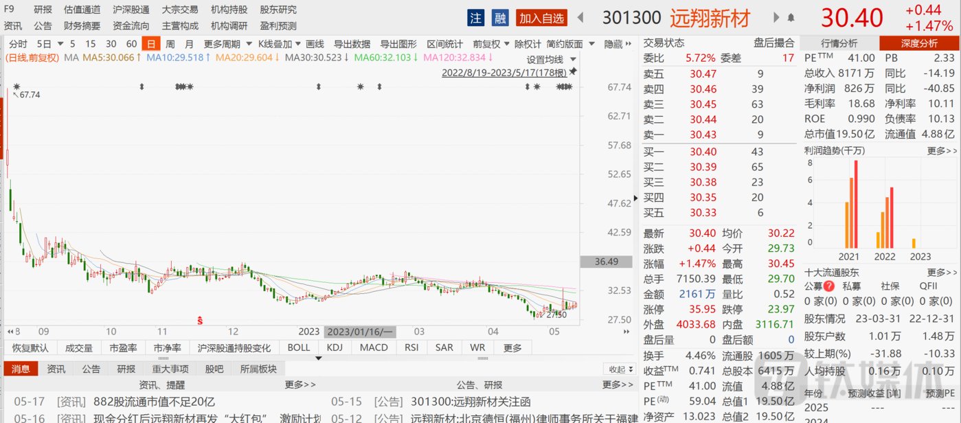 实际上,远翔新材去年刚刚在创业板上市,不过股价却是“上市即巅峰”,自上市首日至今年5月17日跌幅近45%,最大回撤近60%,目前总市值为19.5亿元。