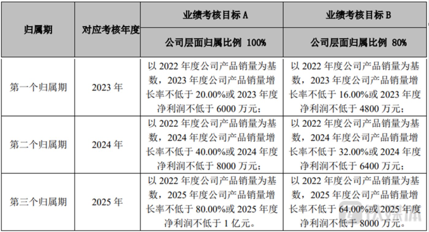 具体来看,业绩考核目标A为2023-2025年产品分别销量增长率分别不低于20%、40%、80%或经审计的归属净利润分别不低于6000万元、8000万元、1亿元;业绩考核目标B为2023年-2025年产品分别销量增长率分别不低于16%、32%、64%或归属净利润分别不低于4800万元、6400万元、8000万元。若公司未满足上述业绩考核目标B,则所有激励对象对应考核当年计划归属的限制性股票均不得归属或递延至下期归属,并作废失效。