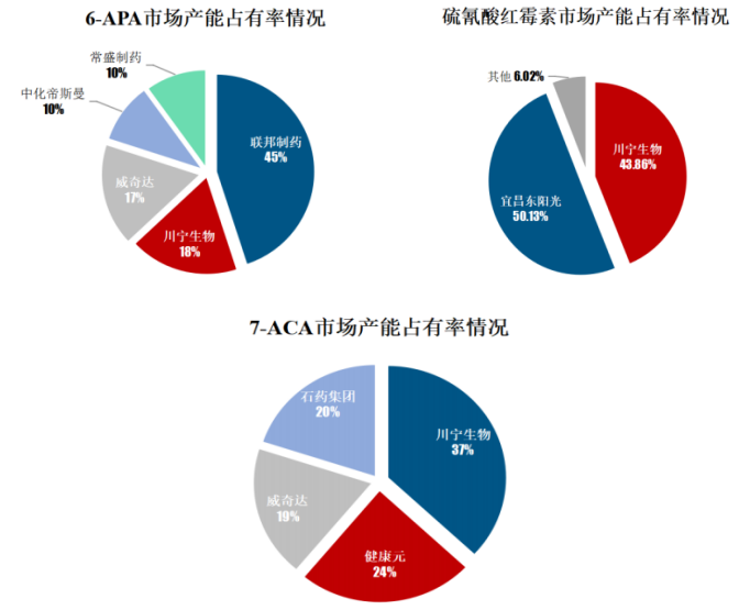 根据招股书显示,川宁生物硫氰酸红霉素的市场产能占有率(简称市占率)43.86%,仅次于国内最大的硫氰酸红霉素生产企业,几乎打下半壁江山;青霉素类中间体6-APA的市占率为18%,领先于常盛制药、中化帝斯曼及威奇达,身居二把手之位;头孢类中间体7-ACA的市占率37%,遥遥领先于石药集团、健康元及威奇达,以老大稳稳自居。
