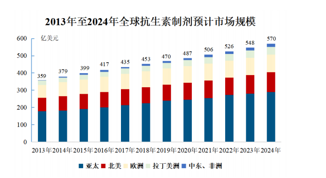 从终端市场来看,目前全球抗生素制剂的市场规模在500 亿美元左右,由于临床治疗对抗生素存在刚性需求,市场整体仍处于低增长区间。