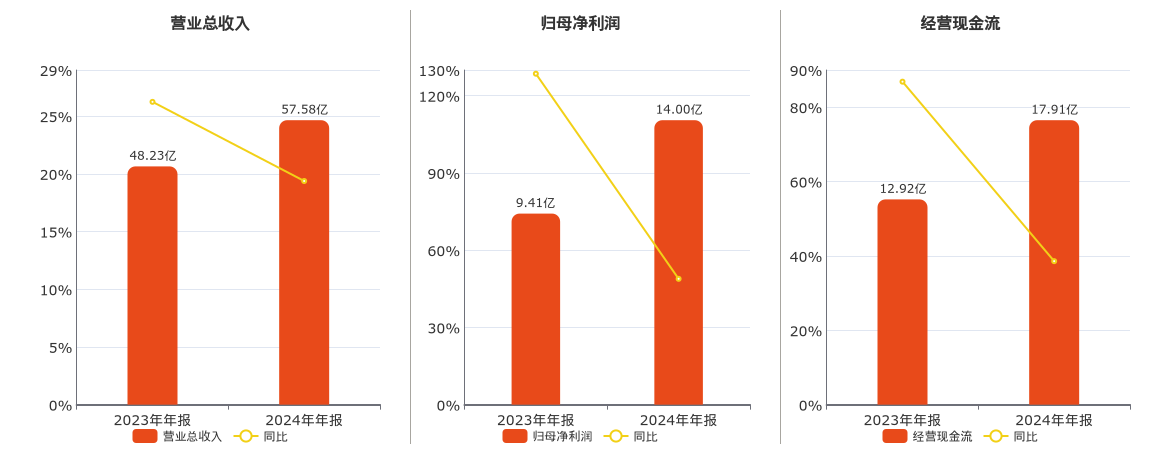 公司营业总收入为57.58亿元。归母净利润为14.00亿元。经营活动现金净流入为17.91亿元。