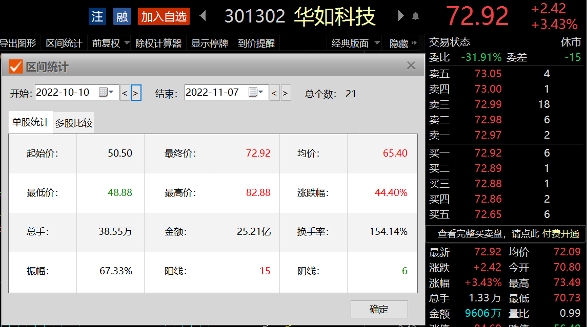 行情方面,进入四季度以来,华如科技涨势如虹。截至11月7日午时收盘,华如科技股价报72.92元,半日涨幅为3.43%,四季度以来累计涨幅达到44.4%,最新总市值76.91亿元。