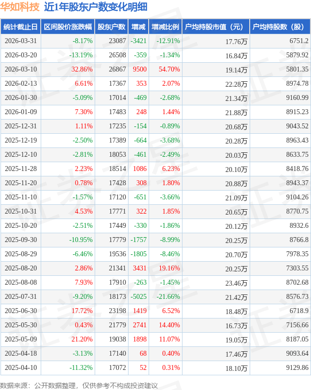 近日华如科技披露,截至2026年3月31日公司股东户数为2.31万户,较3月20日减少3421.0户,减幅为12.91%。户均持股数量由上期的5880.0股增加至6751.0股,户均持股市值为17.76万元。