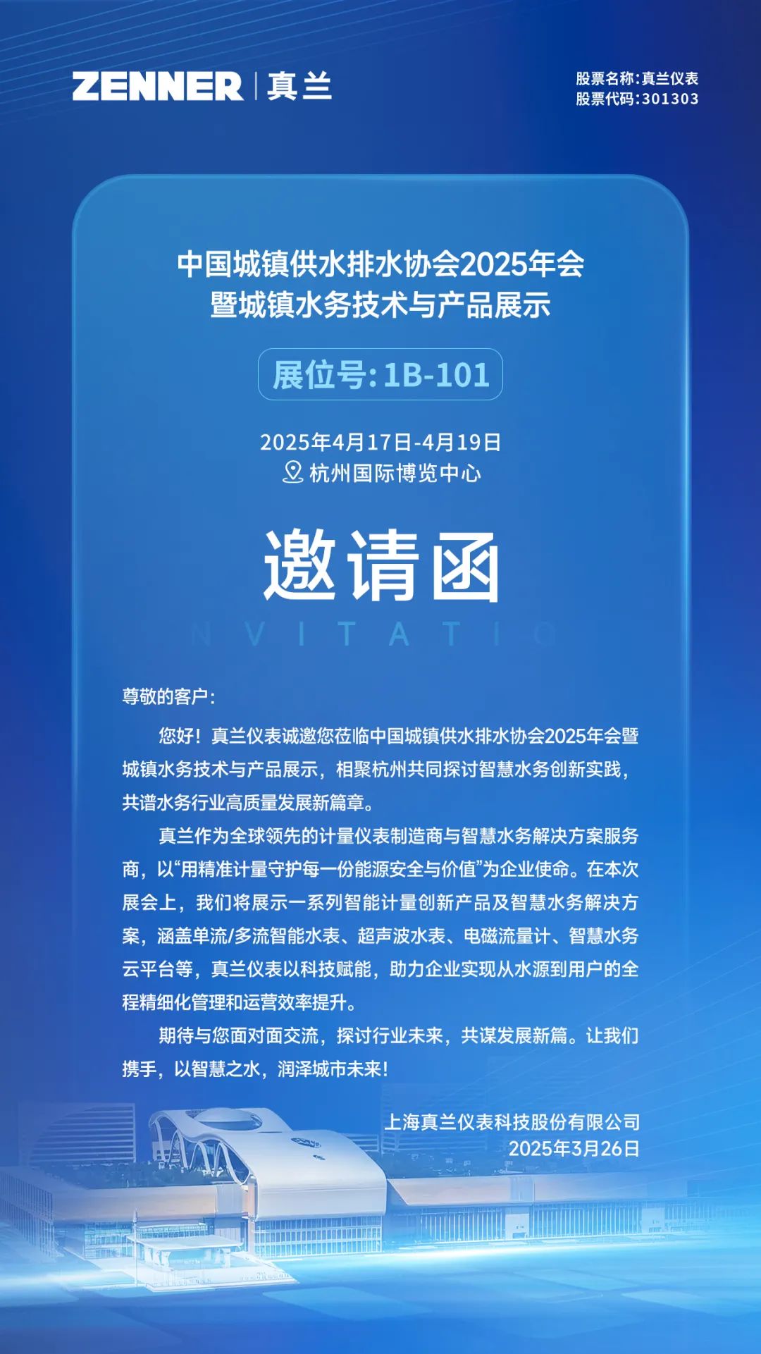 水资源的智慧管理与高效利用,正成为推动城市可持续发展的关键力量。中国城镇供水排水协会2025年会暨城镇水务技术与产品展示即将在杭州盛大开幕,真兰仪表致力于为城镇水务提供高效、智能的解决方案,在此诚挚邀请您莅临现场:真兰仪表展位【1B-101】,共同见证盛事,共同绘制水务未来新篇章!