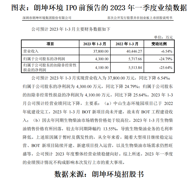 对此,朗坤环境解释,公司2023年一季度业绩下滑的原因属于暂时及偶发性,从全年来看,随着大型项目继续稳定运营、BOT新项目陆续开建、新建项目投入运营,以及生物柴油市场需求仍然旺盛等,公司预计2023年度整体经营业绩稳健向好。因此,公司2023年一季度的业绩预计情况不构成影响本次发行上市的重大事项。