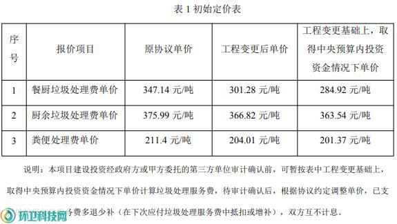同时,处理费单价也相应调低,餐厨垃圾处理费变更为301.28元/吨,厨余垃圾处理费变更为366.82元/吨,粪便处理费变更为204.01元/吨。在此基础上,取得中央预算内投资资金情况下,单价进一步下调为餐厨垃圾处理284.92元/吨,厨余垃圾处理363.54元/吨,粪便处理201.37元/吨,与原协议相比,分别下调17.92%、3.31%和4.74%。